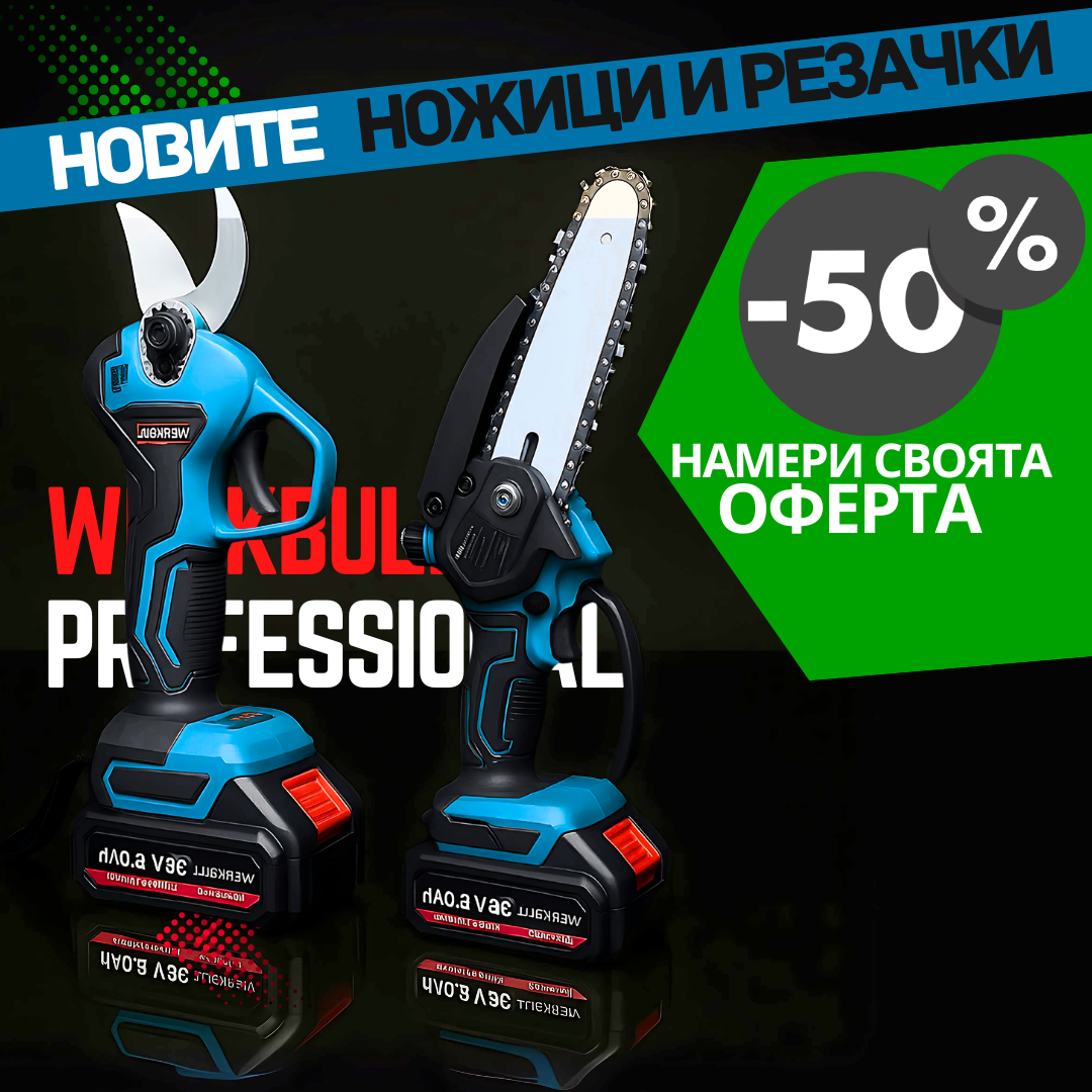 Вижте пълните подробностиПромо 3в1 комплект WerkBull Акумулаторна Лозарска ножица с дисплей и Мини Трион с автоматично омасляване + Телескопичен Прът